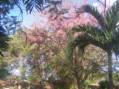 Hello and welcome to Garden Blogger's Bloom Day where gardeners around the globe show what is blooming in their gardens. Earlier this week as the Rustic Bajan gardener strolled she spied a pink cloud amongst the tree tops.